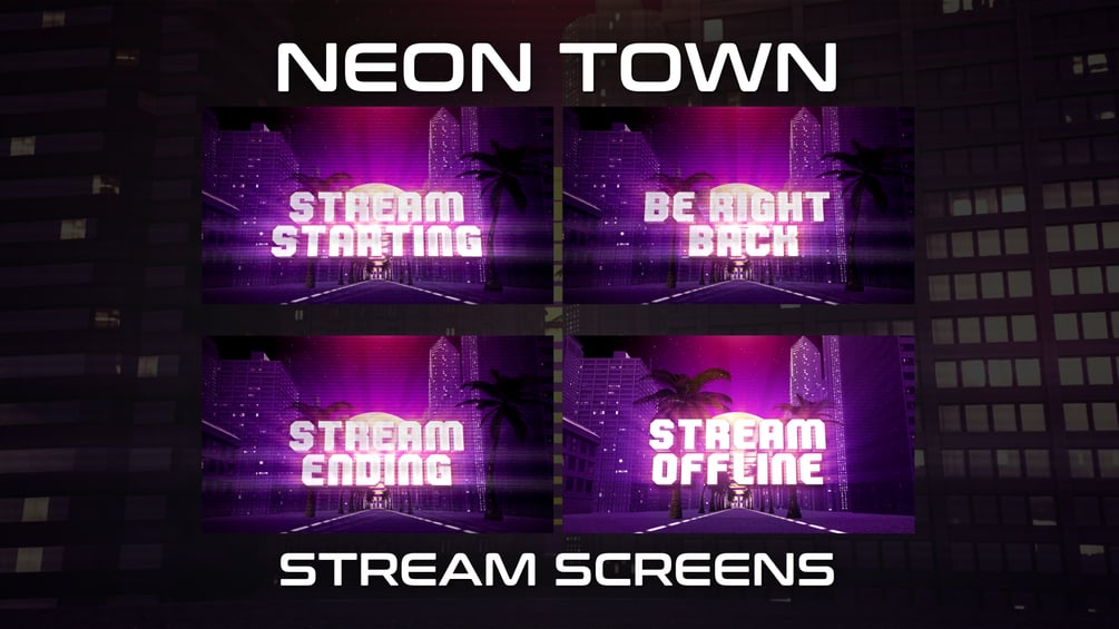 Neon Town stream graphics animated start, BRB, end and offline screens